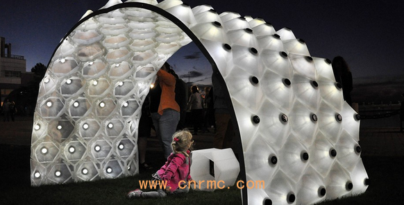 它是由94塊數(shù)字化設(shè)計(jì)制造的模塊化3D打印構(gòu)件組成的,被開(kāi)發(fā)者稱為太陽(yáng)能字節(jié)亭。它通過(guò)其實(shí)驗(yàn)性的嵌入技術(shù),在白天吸收太陽(yáng)能儲(chǔ)存起來(lái),然后在晚上變成一個(gè)發(fā)光的結(jié)構(gòu)。此外,建筑師們將其設(shè)計(jì)成拱形結(jié)構(gòu)也是為了更好地跟蹤太陽(yáng)在一天時(shí)間里的直射路徑,從而每一天都能獲得盡可能多的太陽(yáng)能。如果哪一天由于云層覆蓋導(dǎo)致獲得的太陽(yáng)能較少,那么晚上這個(gè)太陽(yáng)能字節(jié)亭也就沒(méi)那么亮,反之亦然。它白天是一個(gè)能遮風(fēng)避雨的亭子,晚上就變成了一個(gè)漂亮的燈塔。