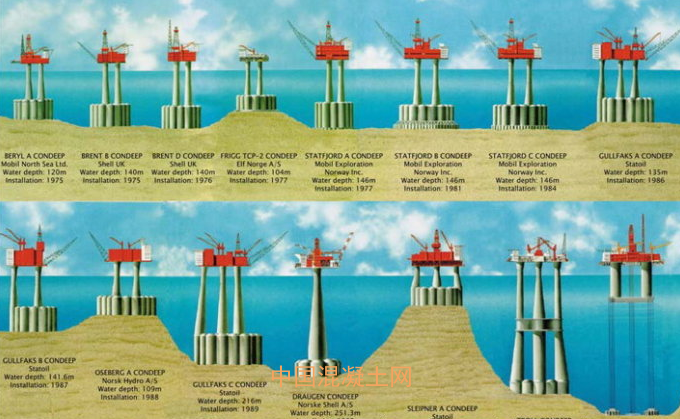 混凝土在海洋環境中真正得到應用開始于上世紀七十年代中期。由于當時中東戰爭引起的第一次石油危機,人們開始大規模地開發海底石油。圖二顯示的是挪威海洋工程技術公司Kvaerner從1975年來設計的一系列大型混凝土海洋結構體,用來開采和儲存海底石油和天然氣。