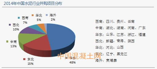 2014年水泥行業(yè)的并購共涉及國內(nèi)六大區(qū)域18個(gè)省份,包括:西南地區(qū)的四川、貴州和云南;中南地區(qū)和湖北、湖南、河南和廣東;華東地區(qū)的山東、江蘇、浙江和福建;西北地區(qū)青海、新疆和陜西;華北地區(qū)的河北和山西;東北地區(qū)的遼寧和黑龍江。從并購案例的分布來看,華東地區(qū)案例數(shù)最多,占48%,其并購案例大多是收購商品混凝土企業(yè)和粉磨企業(yè)。對水泥熟料產(chǎn)能布局有影響的并購主要集中在中南地區(qū)和西南地區(qū),這兩個(gè)地區(qū)也是水泥需求保持穩(wěn)定增長的地區(qū)。