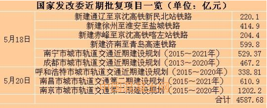 在此前的5月18日,國(guó)家發(fā)改委批復(fù)了通遼連接京沈客專(zhuān)快速鐵路、徐州至淮安至鹽城鐵路、赤峰至京沈高鐵喀左站鐵路、濟(jì)南至青島高速鐵路,以及南寧和成都的城市軌道交通近期建設(shè)規(guī)劃,這6大項(xiàng)目總投資2435.77億元。