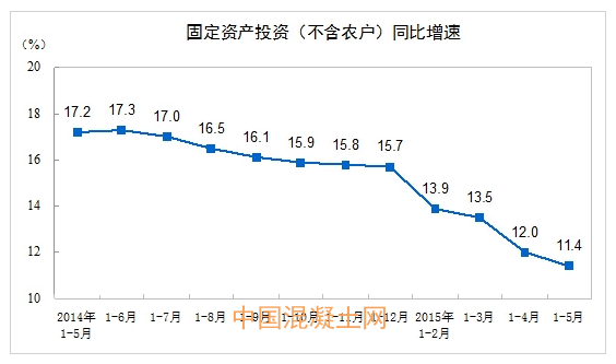2015年1-5月份,全國固定資產投資(不含農戶)171245億元,同比名義增長11.4%,增速比1-4月份回落0.6個百分點。從環比速度看,5月份固定資產投資(不含農戶)增長0.86%。