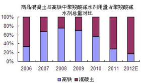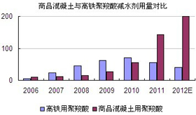砼網認為:我國減水劑行業是個朝陽行業,還有很大的提升空間。2011年,水泥產量為20.62億噸,由于每立方米混凝土的水泥用量為330KG,因此混凝土總量約為40.83億方;同時2011年減水劑消費總量為510萬噸,每立方米混凝土的減水劑用量為2.5KG,則約有20.4億方的混凝土使用了減水劑,較2010年增長了3億方,應用范圍增長到50%。雖然增幅不大,但是仍呈上升的趨勢。另外,聚羧酸減水劑的使用也更傾向于商品混凝土。2011年聚羧酸減水劑總量為198萬噸,其中用于商品混凝土中的聚羧酸減水劑為143萬噸,占了聚羧酸減水劑總量的72%,較2010年徹底來了個“大翻身”。反觀高鐵行業,2011年聚羧酸減水劑中用于高鐵等野外工程僅55萬噸,只占了總量的28%,較2010年減少了30%,明顯少了一大截。此外,雖然鐵路建設專家王夢恕一直強調高鐵投資不會低于5000億元,但是低迷的形勢與資金的短缺仍然是不爭的事實,高鐵的疲軟態勢將繼續延續至2013年。