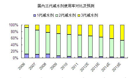 說到減水劑,不得不提的是國內3代減水劑的使用情況。就目前情況來說,1代減水劑已經基本退出了歷史的舞臺。而2代減水劑(萘系減水劑)和3代減水劑(聚羧酸減水劑)中,2代減水劑占據著主導地位。在此,順便提一句,中國是目前世界上少數幾個仍是以萘系減水劑占主導的國家之一。不過,從下圖可以看到,聚羧酸系減水劑正逐漸擴大自己的市場。