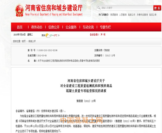 河南省住房和城鄉建設廳在2012年就通報過有問題的混凝土生產企業