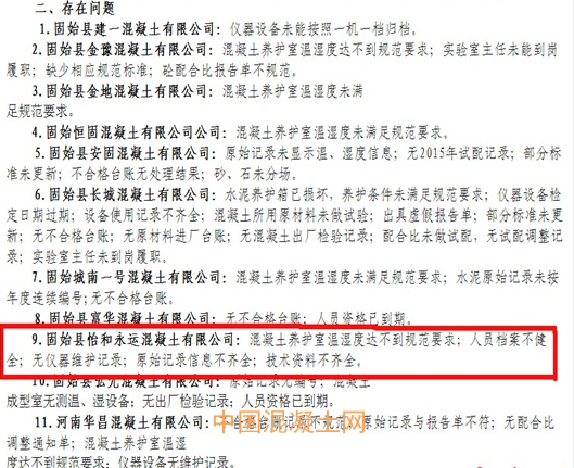 今年6月2日,又因混凝土養護室溫濕度達不到規范要求;人員檔案不健全;無儀器維護記錄;原始記錄信息不齊全;技術資料不齊全等問題,被固始縣住房和城鄉建設局點名通報。