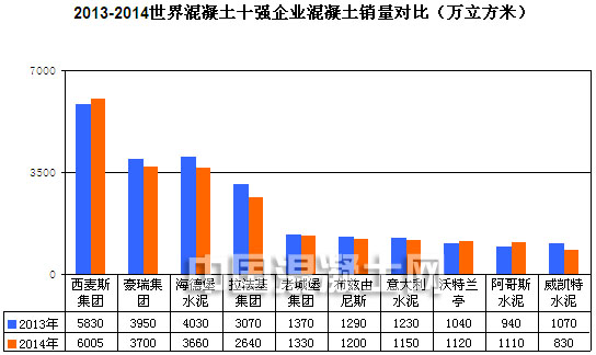 全球最大的建筑材料和水泥生產商之一墨西哥Cemex集團在2014年世界混凝土十強評選中依然雄居榜首,集團2014年混凝土銷量6005萬立方米,同比增長3%,集團在哥倫比亞、多米尼加共和國、危地馬拉、以色列和克羅地亞實現了創記錄的混凝土銷量,全年的水泥和骨料銷量同比增長了4%。