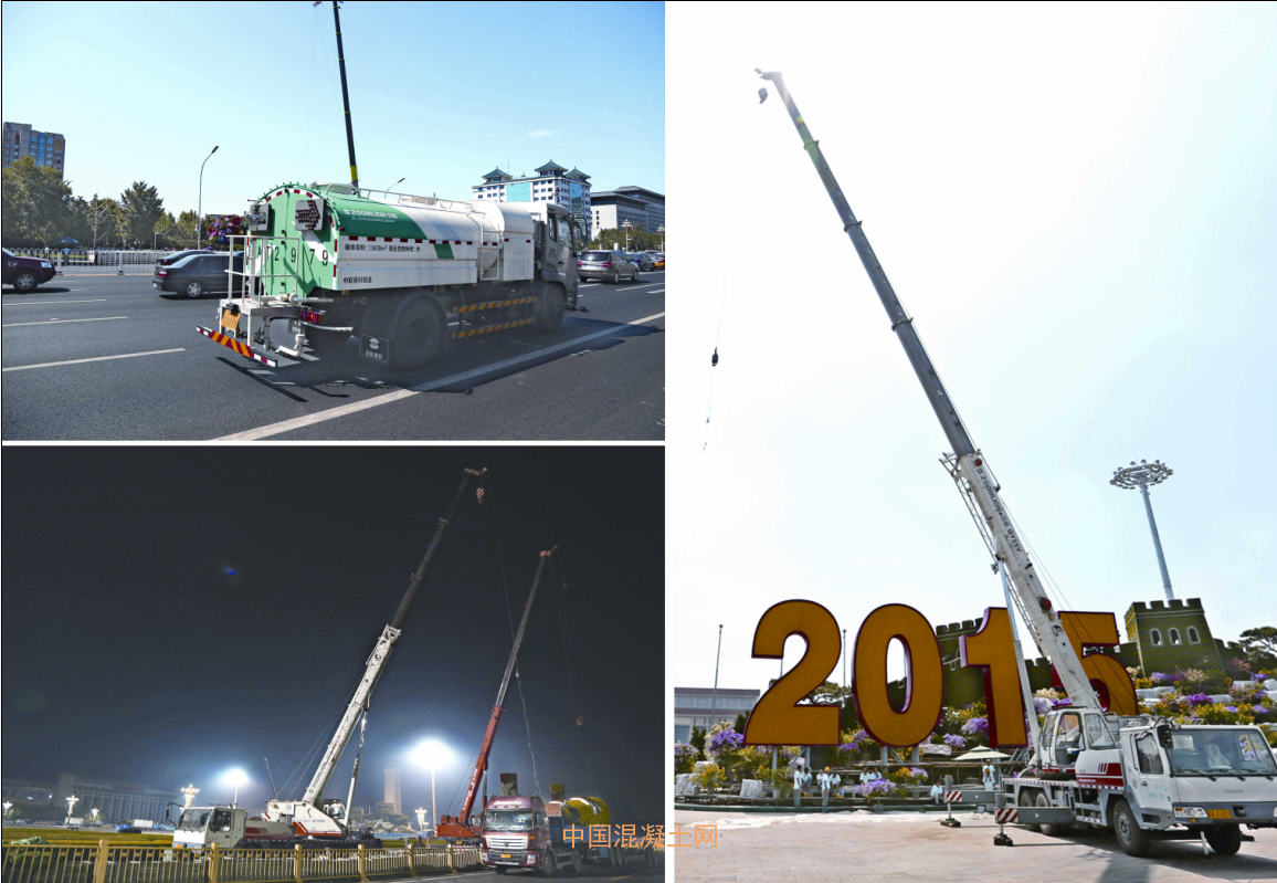 2009年,國慶60周年慶典現場,中聯重科多臺汽車起重機支撐現場直播拍攝;2011年建黨90周年之際,中聯起重機在天安門廣場布置“紅心向黨”大型立體花壇;2014年,為迎接建國65周年,中聯重科起重機參與天安門花籃吊裝及整體布展工作。