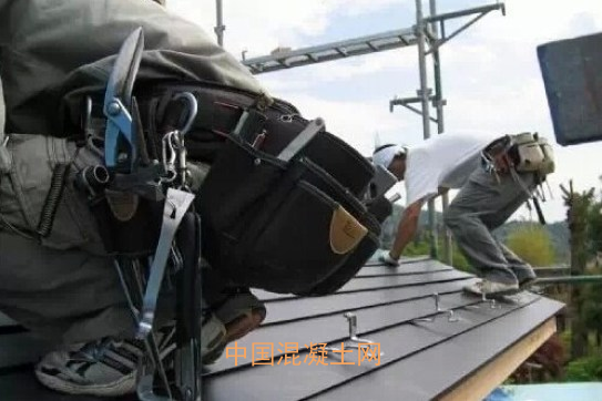 STEP13,屋頂墨綠色的柏油防水卷材上面,安裝長條的屋面板板材罩面。屋面板材上的少量鍍鋅鋼制件,為將來屋頂安裝太陽能電池板做準備。