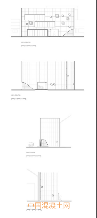 建筑通過從樓板到頂板的長形開口和遍布混凝土立面的方窗來柔化建筑堅定的外表。此外,建筑還在尖銳三角形的角端采用挖槽的手法,并在一層通過玻璃的使用使建筑強硬的實體形式得到喘息。