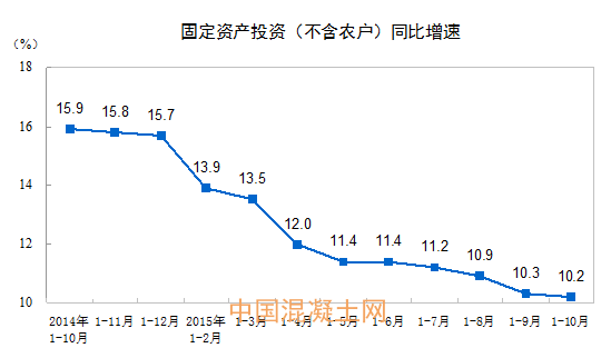 2015年1-10月份,全國固定資產(chǎn)投資(不含農(nóng)戶)447425億元,同比名義增長10.2%,增速比1-9月份回落0.1個百分點。從環(huán)比速度看,10月份固定資產(chǎn)投資(不含農(nóng)戶)增長0.72%。