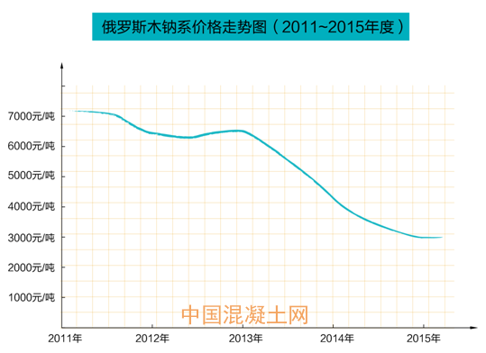 萘系減水劑另外一個主要原材料木質素磺酸鈉和木質素磺酸鈣也受到整個建材市場的波及,價格受到比價大的波動,由于市場需求量急劇減少,導致大量原料供過于求,國內外生產廠家主動下調價格來爭取更多市場。對比主要2個木質素出口大國俄羅斯和南非,俄羅斯的木質素磺酸鈉價格更是跌到谷底,這跟俄羅斯本國經濟低迷也有一定關系。近4年俄羅斯木質素價格如圖2: