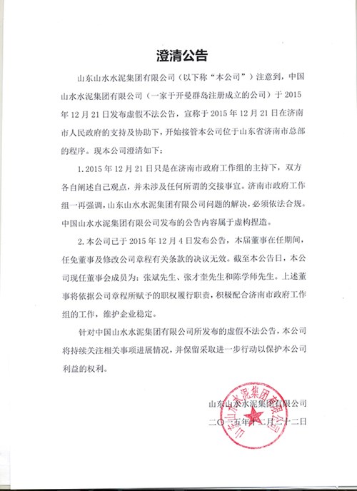 山東山水水泥:中國山水水泥12月21日公告的內容屬于虛構捏造;12月21日并未涉及任何所謂的交接事宜。澄清公告全文如下: