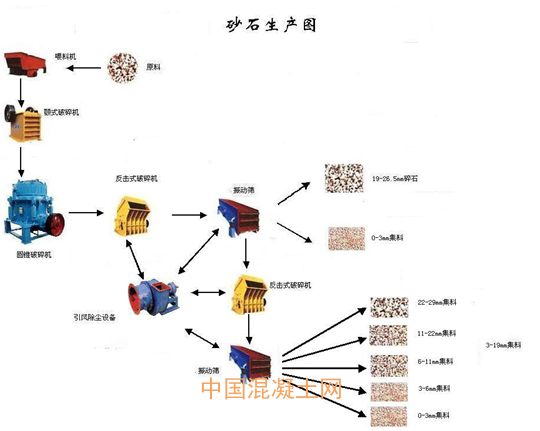 理想的集料是有堅硬棱角、粗表面紋理、近似立方體形狀、有優良級配曲線的潔凈碎石,為了滿足上述要求,碎石加工工藝流程一般為:喂料機→鄂式破碎機→圓錐機→反擊破碎機→振篩機→成品。