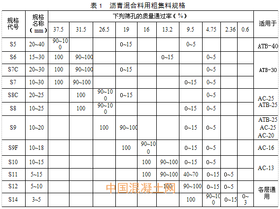 根據國家現行《公路瀝青路面施工技術規范》,粗集料應該潔凈、干燥、表面粗糙,級配應符合表1的規定。當單一規格集料的指標達不到表1要求,而按照集料配比計算的指標符合要求時,工程上允許使用。在研究中發現現行規范中S7、S8、S9、S10四檔料在工程應用中級配難以控制,增加了S7C、S8C、S9F三種集料規格。
