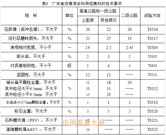 根據以上分析,結合廣東省交通運輸廳的《瀝青路面應用技術指南》,考慮到廣東省氣候條件,提出的粗集料相關指標要求見表8至表11。