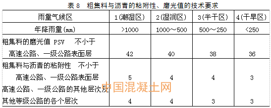 粗集料與瀝青的粘附性應符合表8的要求,當使用不符要求的粗集料時,宜摻加消石灰、水泥或用飽和石灰水處理后使用,必要時可同時在瀝青中摻加耐熱、耐水、長期性能好的抗剝落劑,也可采用改性瀝青的措施,使瀝青混合料的水穩定性檢驗達到要求。摻加外加劑的劑量由瀝青混合料的水穩定性檢驗確定。