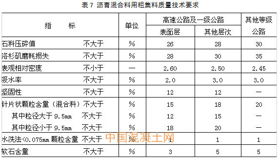 瀝青路面用粗集料包括碎石、破碎礫石、篩選礫石、鋼渣、礦渣等,但高速公路和一級公路不得使用篩選礫石和礦渣。粗集料必須由具有生產許可證的采石場生產或施工單位自行加工。粗集料應該潔凈、干燥、表面粗糙,質量應符合表7的規定。當單一規格集料的質量指標達不到表中要求,而按照集料配比計算的質量指標符合要求時,工程上允許使用。集料在進入拌和機前,需經200℃左右的高溫,有些常用的石料如花崗巖、玄武巖、石灰巖等有可能因此發生質量上的變化;對受熱易變質的集料,宜采用經拌和機烘干后的集料進行檢驗。