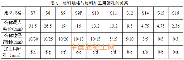 通過大量實際工程的集料加工,總結出各種集料規格與加工用篩孔的關系如表5所示。