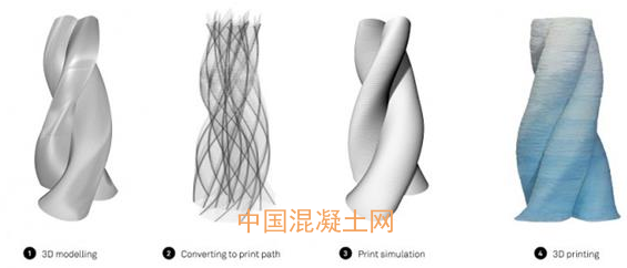 基本上,該公司已經開發出一種以高分辨率的方式3D打印混凝土的方法。由于他們可以在現場自己制造水泥,因此很容易打印出彩色對象,甚至創造出顏色變化的效果。除此之外,Bruil的機器還可以實現不同的造型結構——比如波浪——從而給建筑師提供了一種創造性的設備,而非單純的制造工具,讓他們的想法通過混凝土來實現,無論是形狀、顏色還是紋理。TheoVoogd因此預測,這將會對建筑行業產生革命性的影響。為了進一步適應建筑師的需要,Bruil還開發出了一款定制的CAD軟件,可以很方便地將3D模型轉換成他們的機器的打印路徑。重要的是,這也使建筑師在啟動一個昂貴的3D打印過程之前能夠預覽一下最后的結果。
