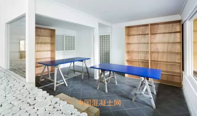 這些有瑕疵的餐具被重新演繹,它們像磚一樣堆疊、砌筑,支撐上部的木材展臺(tái)來展示出售的產(chǎn)品。平臺(tái)被刻意保留它們?cè)嫉陌咨怀鲐S富多彩的陶瓷展品。