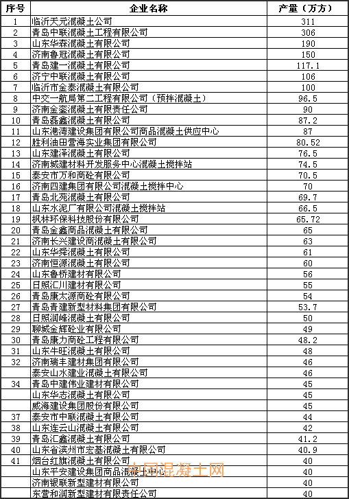2015年山東省預拌混凝土產量前40萬方以上的企業名單