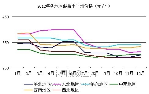 2012年,由于水泥市場(chǎng)形勢(shì)低迷,全國各地區(qū)水泥價(jià)格均受到不同程度的下跌。多個(gè)地區(qū)水泥企業(yè)開始實(shí)行停窯限產(chǎn),但還是難以阻止水泥價(jià)格下行,作為下游的混凝土行業(yè)也受到一定程度的牽連,價(jià)格跌破300元/噸。