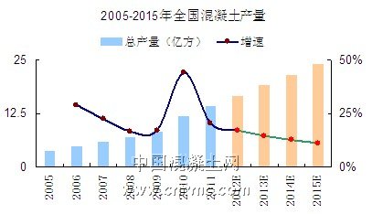 我國混凝土行業(yè)正在不斷提高商品化率,即使在宏觀經(jīng)濟(jì)并不看好的情況下,商品化率依然有所增長,據(jù)中國混凝土網(wǎng)統(tǒng)計(jì),2012年我國混凝土行業(yè)總產(chǎn)量為16.63億立方米左右,同比增長將達(dá)到17.0%,與往年相比,增速雖有所回落,但隨著我國混凝土商品化率的不斷普及,商品混凝土產(chǎn)量還將保持繼續(xù)增長態(tài)勢(shì)。另一方面,2012年我國水泥累計(jì)產(chǎn)量22億噸,同比增長6.6%。作為混凝土行業(yè)的上游產(chǎn)業(yè),水泥產(chǎn)量的增長,也相應(yīng)的帶動(dòng)了混凝土產(chǎn)量的增長。