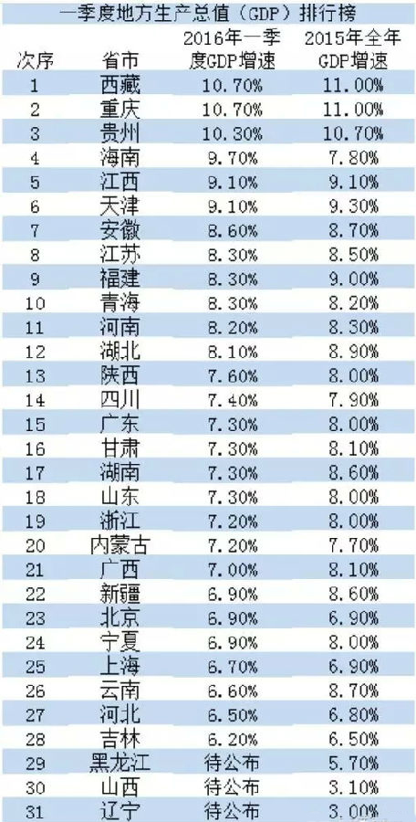 數據顯示,24個省份的一季度GDP增速超過全國GDP增速6.7%,上海市的增速與全國增速持平,僅云南、河北和吉林三個省份低于全國增速。目前,黑龍江、山西和遼寧尚未公布第一季度的經濟成績單。