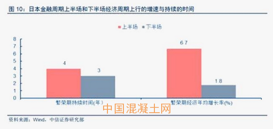 因此,即使金融周期下半場的經(jīng)濟(jì)周期處于上行階段,其動力和持續(xù)性一般都會比上半場中的要弱。比如,日本在金融周期見頂之前經(jīng)歷的一個繁榮時段,年均經(jīng)濟(jì)增速為6.7%,持續(xù)時間達(dá)4年(1987-1990),金融周期見頂后經(jīng)歷的一個復(fù)蘇時期年均經(jīng)濟(jì)增速只有 1.8%, 持續(xù)時間也縮短至3年(1995-97)。
