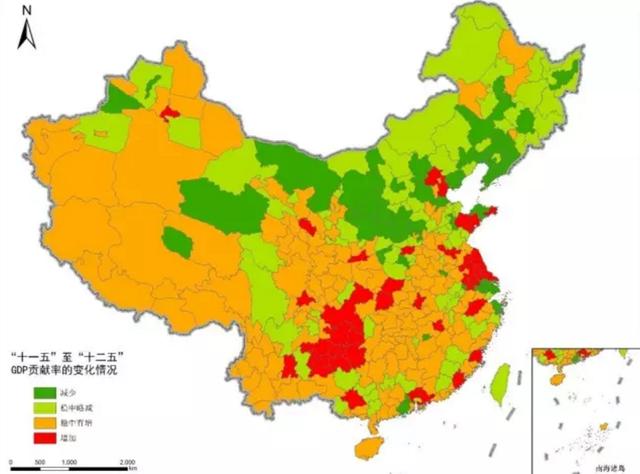 其中,有217個(gè)單元全國(guó)經(jīng)濟(jì)增長(zhǎng)貢獻(xiàn)率增大,占單元數(shù)量的64.20%,其中,貢獻(xiàn)率顯著增加(增幅大于0.1%)的有32個(gè)單元,占單元總數(shù)的9.47%。主要有東北地區(qū)的綏化、大慶、吉林、牡丹江、沈陽(yáng)、大連、通遼和赤峰等城市,海峽西岸的福州、泉州、漳州、揭陽(yáng)、龍巖和三明等城市,長(zhǎng)江中游以及中部地區(qū)的徐州、合肥、蕪湖、武漢、黃岡、襄樊、宜昌、荊門、岳陽(yáng)、長(zhǎng)沙和衡陽(yáng)等城市,黃河中游的朔州、西安、榆林、鄂爾多斯等城市,長(zhǎng)江上游地區(qū)的重慶和成都,以及西北地區(qū)的海西州等。在地域上,這些單元分布比較分散,各大區(qū)域均有分布,東北、長(zhǎng)江中游、黃河中游和海峽西岸地區(qū)有一定集中。這種分布格局反映了新世紀(jì)頭10年在“入世”效應(yīng)帶動(dòng)下加工制造業(yè)快速發(fā)展,以及由此帶來(lái)的能源原材料產(chǎn)業(yè)大規(guī)模擴(kuò)張支撐經(jīng)濟(jì)增長(zhǎng)的特點(diǎn)。