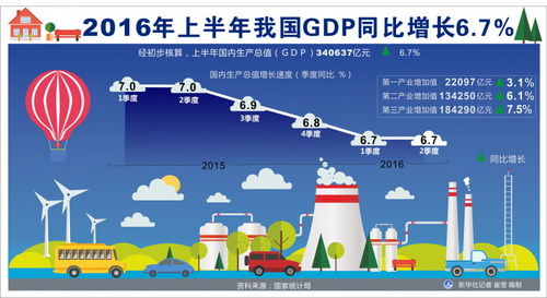 近日,國家統計局公布二季度經濟數據,2016年上半年我國GDP達340637億元 同比增6.7%。