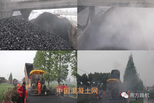 瀝青攪拌站在常規熱拌與溫拌卸料和攤鋪時的對比,采用溫拌技術,藍煙明顯減少。