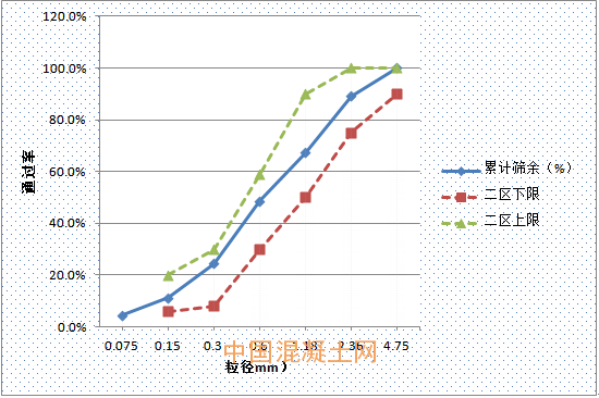 如下圖所示,甘肅建投V7制砂生產(chǎn)線的成品砂顆粒級配曲線嚴(yán)格落在國家建設(shè)用砂標(biāo)準(zhǔn)機制砂顆粒級配二區(qū)范圍內(nèi)。