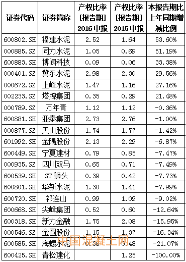產權比率是負債總額與所有者權益總額的比率。一般來說,產權比率可反映股東所持股權是否過多,或者是尚不夠充分等情況,從另一個側面表明企業借款經營的程度。產權比率越低表明企業自有資本占總資產的比重越大,長期償債能力越強。整體而言,在該項指標上,水泥行業的產權比率普遍有所降低,僅6家公司產權比率較去年同期上升。詳情如下表: