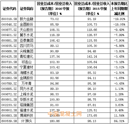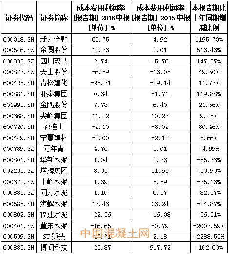 以下是今年中報顯示的20家上市水泥企業的成本費用利用率情況: