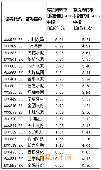 從行業整體來看,據Wind數據顯示,2016年年中,20家上市水泥企業存貨(合計)達750.59億元,比2015年年中的745.37億元增加了5.22億元,增幅為0.7%,與去年幾乎持平。