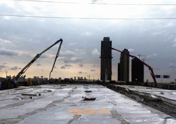 剛剛施工完畢的最后一塊主線箱梁由于地處江堤中路和漢新大道交匯路口上方,再加上其上有220KV高壓電線橫穿,交通狀況復(fù)雜,施工風(fēng)險大,為保證其連續(xù)施工,漢陽廠在前期進行充分策劃,過程實行全方位監(jiān)控,確保整條施工段混凝土最終順利完成施工供應(yīng)。
