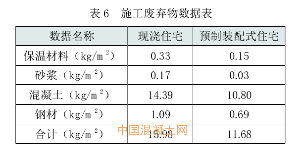 混凝土剪力墻結構建造廢棄物包括鋼材、木材、混凝土塊、砂漿、保溫材料等。本測評只對廢棄鋼材、混凝土、砂漿、保溫材料進行測算。施工廢棄物數據見表6。