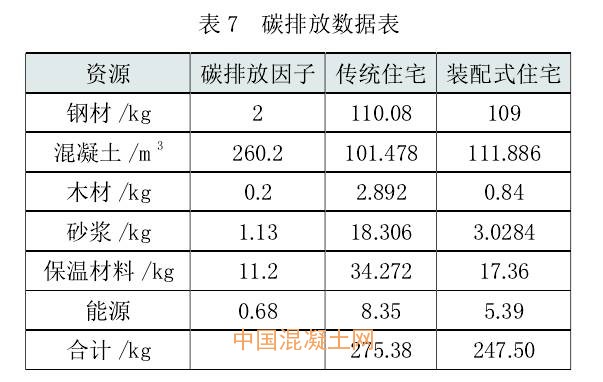 綜合環境影響評價因素包括氣候變暖、臭氧層破壞、酸化、富營養化等多個方面。本文重點針對碳排放影響因子進行數據比較。將現澆住宅和預制裝配式住宅單位面積物資能源消耗,統一折算為碳排放指標,如表7所示。
