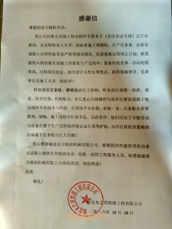 十一月,秋風漸起,寒意漸濃,而我們收到一封特別暖心的郵件,溫暖了每一位服務一線工作崗位人員的心窩。這是一封來自湖北木之君鐵路工程有限公司發來的感謝信,客戶對南方路機(官網:http://www.nflg.com 微信公眾號:NFLG)自密實混凝土移動攪拌車在工地現場的的卓越性能表現和服務工程師認真細致、耐心、吃苦耐勞的服務態度,高效的專業服務水平表達了衷心的感謝。