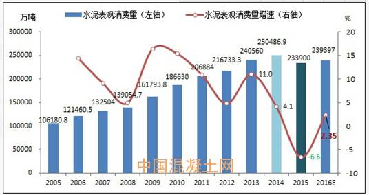 2016年全國水泥表觀消費(fèi)量及增速預(yù)估