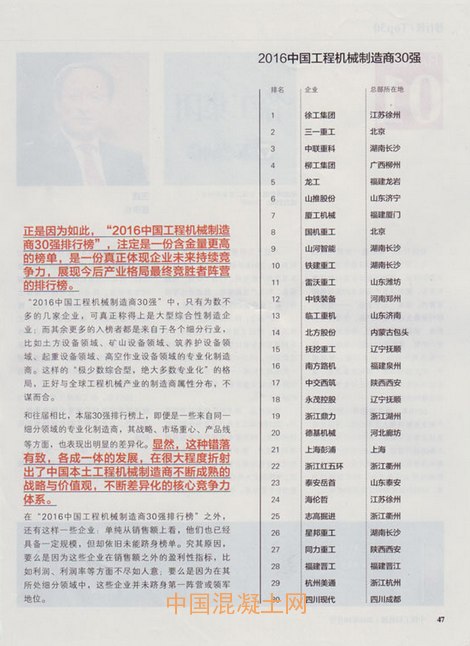 本屆2016中國工程機械制造商30強排行榜將視野拓展至中國工程機械各個細分領域,關注各不同板塊中運營質量、排名領先、市場地位、持續發展能力。
