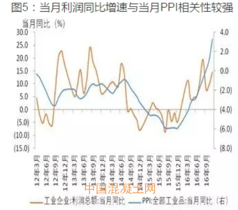 預計12月利潤同比增速略放緩,高增速可持續至明年一季度末二季度初,杠桿率在2017年將有所回落。第一,進入12月以來,前期漲幅較大的動力煤價格下降,螺紋鋼、水泥在中旬達到高點后回落,南華工業品指數回落,但預計全月平均南華工業品指數和PPI環比仍為正。2013、2014和2015年12月利潤環比增速分別為33%、26%和22%,近三年12月環比速度能夠延續11月環比高增速(平均22%)一方面源于PPI的穩定或者略有上行,另一方面源于生產上行??紤]到12月工業生產受到霧霾限產停產,12月生產將略有下滑,預計帶動12月份利潤增速環比和同比均略回落。第二,由于2016年PPI前低后高,供給端繼續收縮,預計2017年PPI在一季度末二季度初達到高點,根據利潤增速與PPI較強的相關關系(圖5和圖6),并考慮今年3、4月份的基數,工業企業利潤預計在二季度初達到高點。第三,伴隨去產能、債轉股和國企改革加速推進,預計2017年工業企業資產負債率將有所回落。