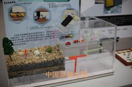 在同學們的設計作品中,“海綿城市”、“透水混凝土”的設計理念被多次提及,可見構建海綿城市的觀念已經深入人心。《透水路面及雨水循環利用系統》《海綿城市這樣‘呼吸’》等作品以豐富的色彩、精美的模型刻畫了海綿城市透水路面的形象,而《彩色透水混凝土路面材料》這一作品更以獨出機杼的動態表達方式——小型噴泉展現透水路面的透水特性。
