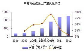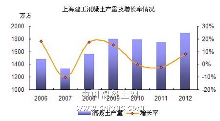 上海城建物資有限公司與上海建工一樣,是上海市知名的混凝土企業之一。2012年,上海混凝土行業發展速度放緩,受此影響,公司混凝土業務銷售收入有所下降,達到12.2億元,較2011年下降了2.56%。但產量有所增加,達到了385萬方,較2011年增加了2.1%。