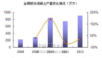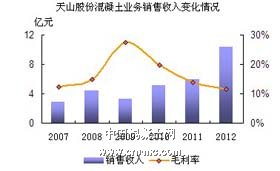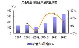 天山水泥:2012年天山水泥混凝土業務業績良好,全年營收10.33億元,較2011年增長了75%;混凝土銷量達342萬方,較2011年增長了20.85%。隨著近幾年公司的穩步發展,區域龍頭地位明顯,為了使市場能力進一步增強,2012年公司增加混凝土產能235萬方,較2011年增長了26%。