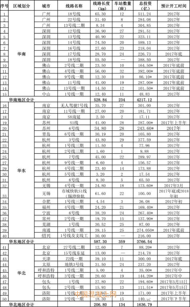 華南地區有廣州、深圳、佛山、中山4座城市,共新增15條新開工線路,合計里程為528.84公里,車站234座,投資額為4217.12億元;