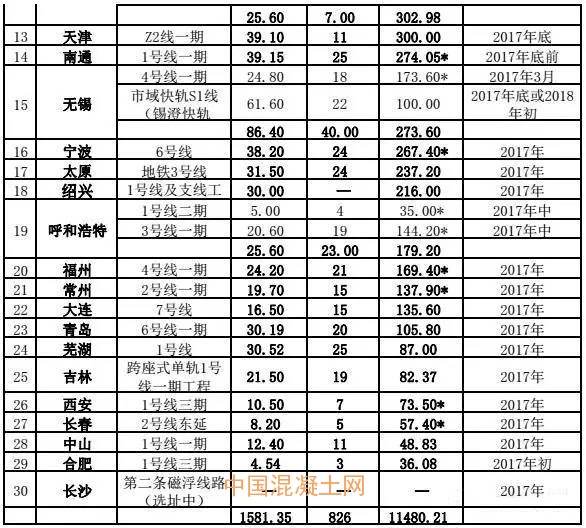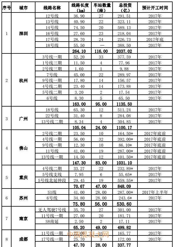 據不完全數據統計顯示,2017年,中國有北京、廣州、深圳、佛山、中山、南京、蘇州、青島、杭州、無錫、合肥、福州、寧波、常州、蕪湖、南通、紹興、天津、太原、呼和浩特、包頭、洛陽、重慶、成都、長沙、鄭州、長春、大連、吉林、西安30座城市軌道交通新增63條即將開工線路,合計里程為1581.35公里,車站826座,總投資額為11480.21億元。