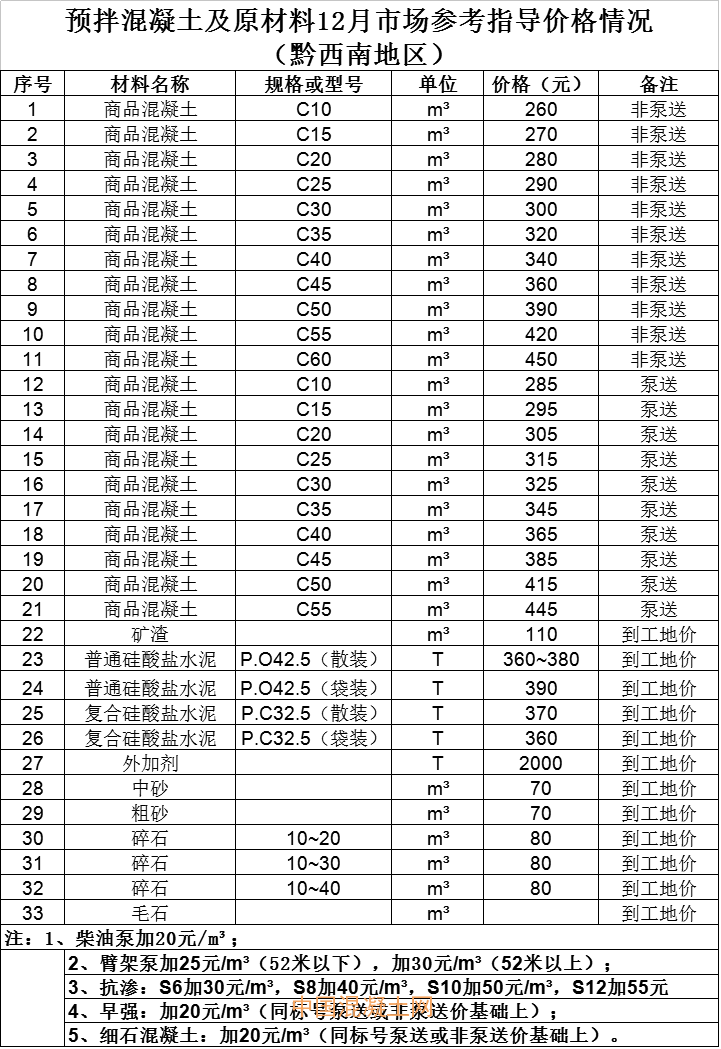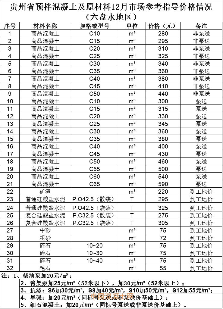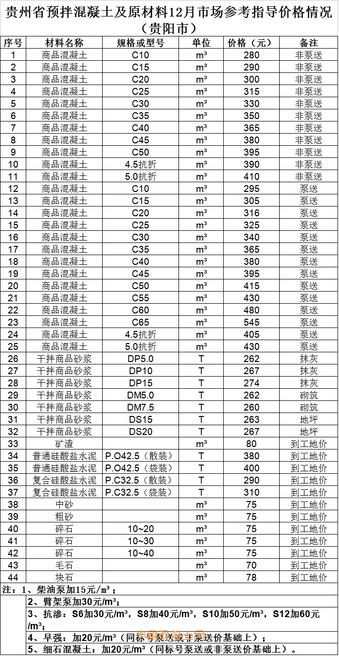 貴州省預(yù)拌混凝土及原材料12月市場(chǎng)參考指導(dǎo)價(jià)格情況