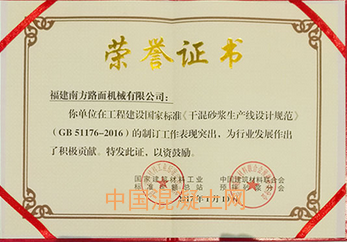 2017年1月10日,在2017'首屆中國國際預拌砂漿裝備技術研討會暨預拌砂漿綠色生產裝備及機械化施工技術峰會上,福建南方路面機械有限公司( 以下簡稱南方路機 官網:http://www.nflg.com 微信公眾號:NFLG)被中國建材聯合會預拌砂漿分會授予“中國預拌砂漿行業裝備制造培訓基地”;同時,因在國家標準GB51176-2016《干混砂漿生產線設計規范》編制工作中的特殊貢獻,被授予“特別貢獻單位”。